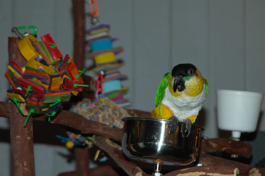 Eunice is a 13 year old Black Headed Caique that was born with a scissor beak (a twisted beak). However, Euince's beak does not hold her back one bit.
